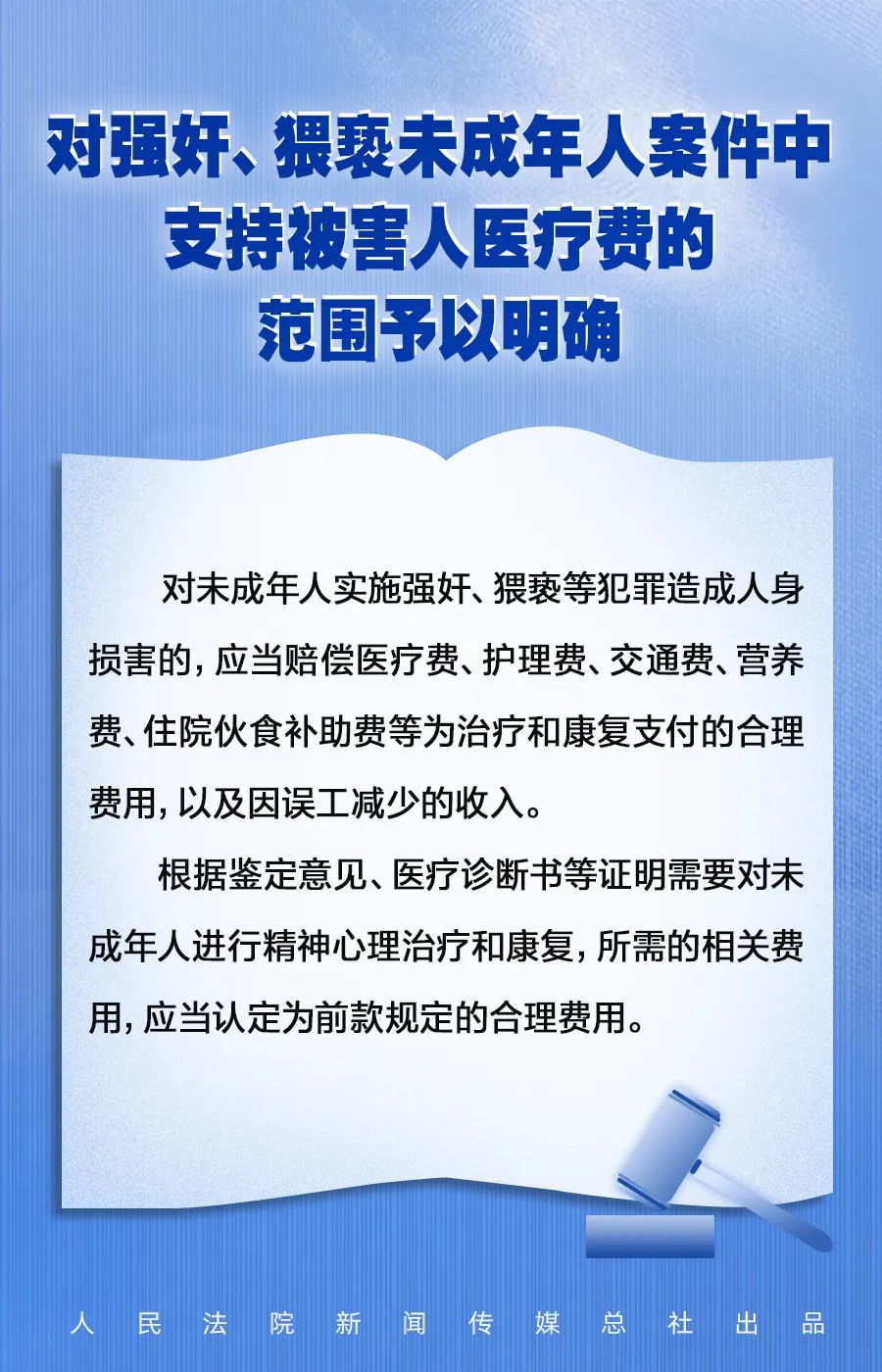 第十四條 對(duì)未成年人實(shí)施強(qiáng)奸、猥褻等犯罪造成人身?yè)p害的,應(yīng)當(dāng)賠償醫(yī)療費(fèi)、護(hù)理費(fèi)、交通費(fèi)、營(yíng)養(yǎng)費(fèi)、住院伙食補(bǔ)助費(fèi)等為治療和康復(fù)支付的合理費(fèi)用,以及因誤工減少的收入。