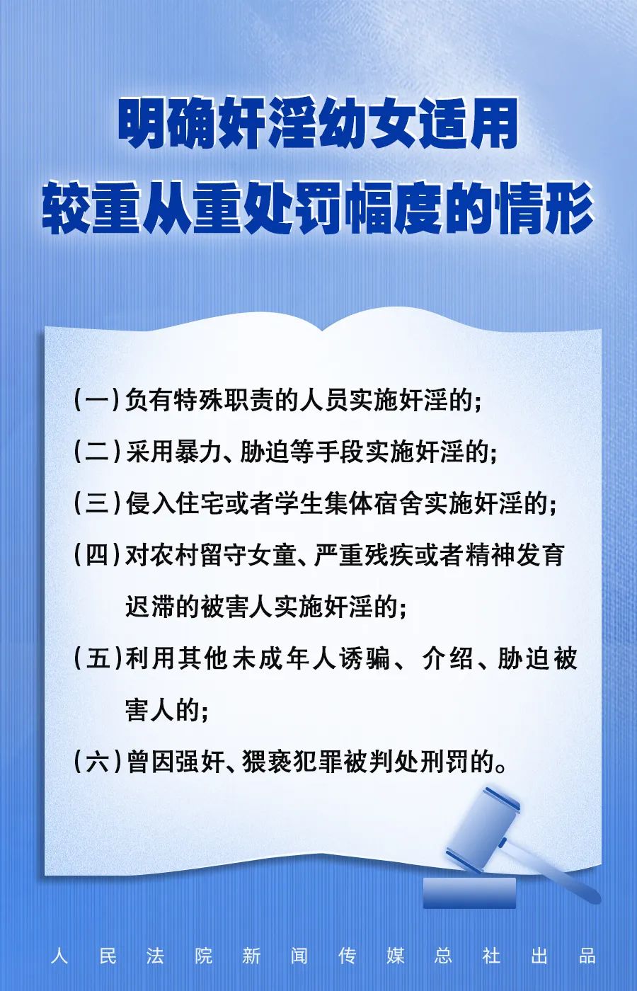 第一條 奸淫幼女的,依照刑法第二百三十六條第二款的規(guī)定從重處罰。具有下列情形之一的,應(yīng)當(dāng)適用較重的從重處罰幅度: