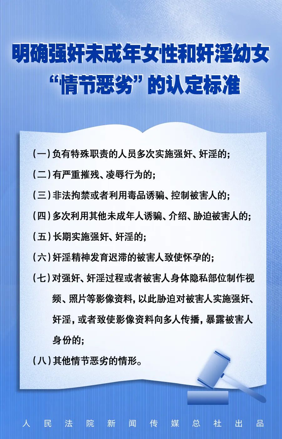 第二條 強(qiáng)奸已滿十四周歲的未成年女性或者奸淫幼女,具有下列情形之一的,應(yīng)當(dāng)認(rèn)定為刑法第二百三十六條第三款第一項(xiàng)規(guī)定的“強(qiáng)奸婦女、奸淫幼女情節(jié)惡劣”: