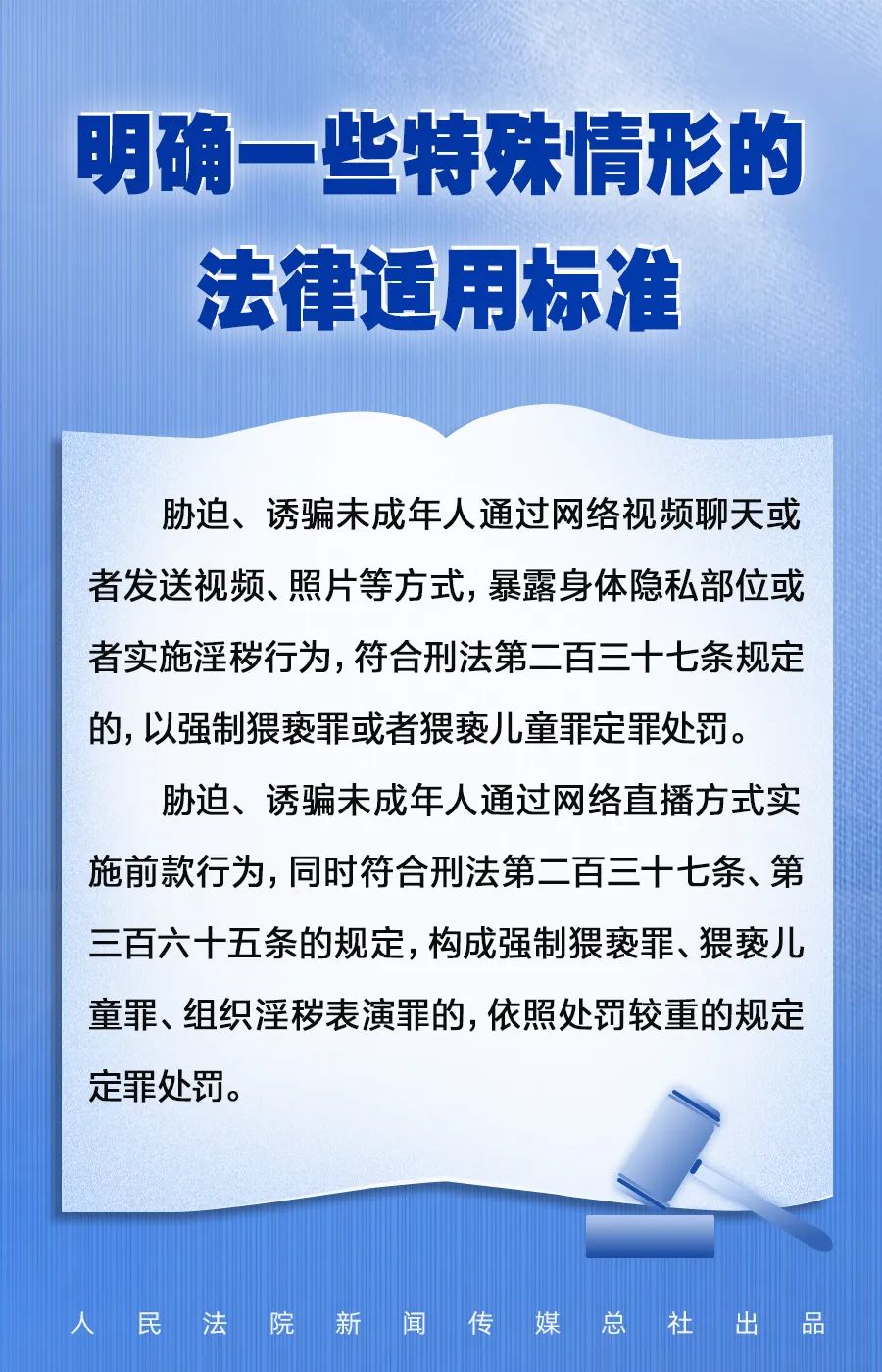 第九條 脅迫、誘騙未成年人通過網(wǎng)絡(luò)視頻聊天或者發(fā)送視頻、照片等方式,暴露身體隱私部位或者實(shí)施淫穢行為,符合刑法第二百三十七條規(guī)定的,以強(qiáng)制猥褻罪或者猥褻兒童罪定罪處罰。