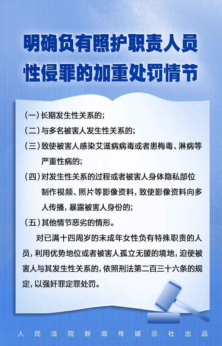 第五條 對(duì)已滿十四周歲不滿十六周歲的未成年女性負(fù)有特殊職責(zé)的人員,與該未成年女性發(fā)生性關(guān)系,具有下列情形之一的,應(yīng)當(dāng)認(rèn)定為刑法第二百三十六條之一規(guī)定的“情節(jié)惡劣”: