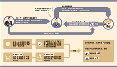 其中,2011年,沈德明利用擔任蘇州監(jiān)獄黨委書記、監(jiān)獄長的職務便利,要求蘇州監(jiān)獄相關工程的承建單位某國資公司將某門窗安裝工程項目交給沈某承接。沈某并不具備承接工程項目的資金、資質(zhì)和能力,在沈德明安排下,沈某將某門窗安裝工程項目交給某施工公司,沈德明要求沈某與某施工公司約定好處費。2014年至2017年,沈某從某施工公司獲取好處費70萬元,沈德明對此予以認可。