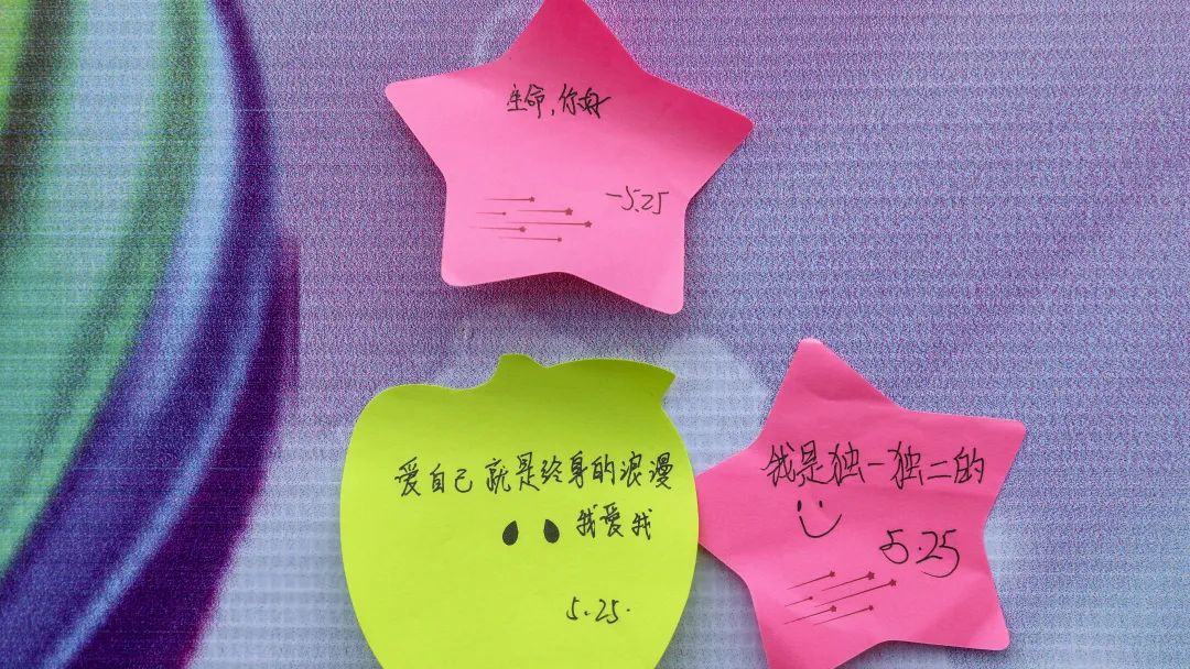 “我是上天的寵兒,我是獨(dú)一無二的存在,我愛我自己,我欣賞我自己,我喜歡我自己,我是最棒的!”在心理賦能環(huán)節(jié),同學(xué)們大聲喊出對自己的肯定。 “愛自己就是終生浪漫的開始。愛自己要善于發(fā)現(xiàn)自己的優(yōu)點(diǎn),勇于接受自己的缺點(diǎn)。”478班學(xué)生代表齊奕霖呼吁同學(xué)們熱愛自己、熱愛生活,以樂觀的方式培養(yǎng)良好的心態(tài),及時(shí)快樂解壓,及時(shí)排解煩惱,活出生命的精彩。 隨后,全體同學(xué)在便簽上寫下了對自己的肯定,并將它們貼在了“生命樹”上。一張小小的便利貼,記錄下來的不僅是文字,更是同學(xué)們對生命的熱愛和期許。