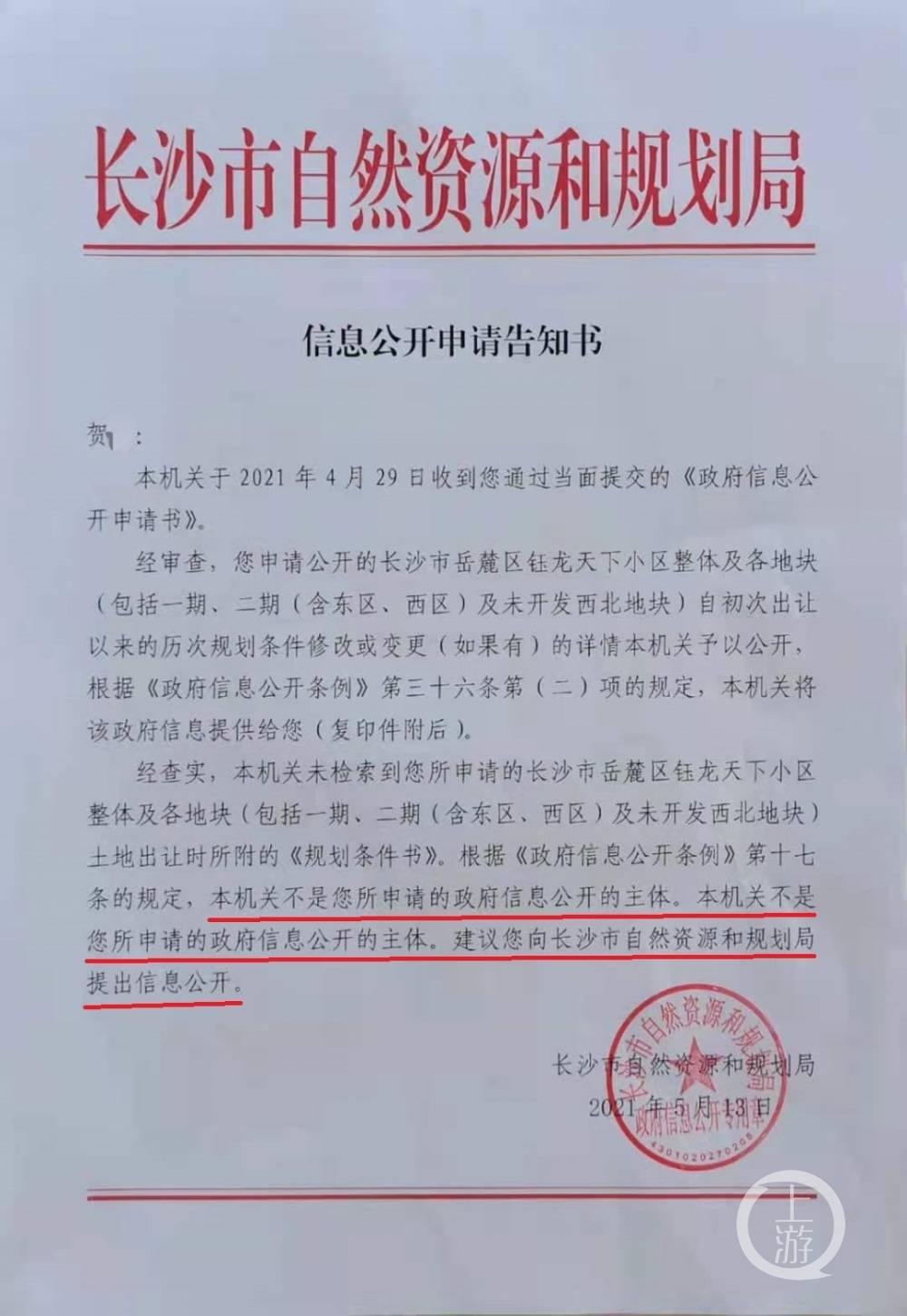 4月29日,有市民提出申請(qǐng)公開長(zhǎng)沙市岳麓區(qū)鈺龍?zhí)煜滦^(qū)整體及各地塊歷次規(guī)劃條件修改或變更的詳情。然而,該文件回復(fù),“本機(jī)關(guān)不是您所申請(qǐng)的政府信息公開的主體”,這句話寫了2遍。同時(shí),文件里還寫到“建議您向長(zhǎng)沙市自然資源和規(guī)劃局提出信息公開”,而文件的落款和印章正是“長(zhǎng)沙市自然資源和規(guī)劃局”。既說(shuō)自己不是信息公開的主體,又讓市民找自己,如此自相矛盾讓人哭笑不得,更傷害了政府權(quán)威和公信力。