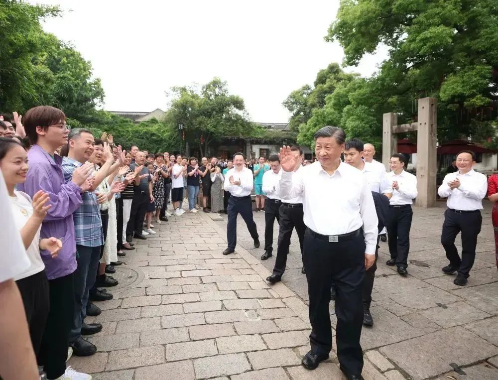 7月5日至7日,中共中央總書記、國家主席、中央軍委主席習近平在江蘇考察。這是6日上午,習近平在蘇州平江歷史文化街區(qū),向當地居民和游客揮手致意。新華社記者 鞠鵬 攝