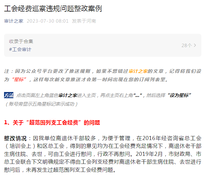 整改情況:因我單位離退休干部較多,為便于管理,在2016年經(jīng)咨詢省總工會(培訓(xùn)會上)和區(qū)總工會,得到的意見均為在工會經(jīng)費充足情況下,離退休老干部生病住院、去世,可由工會進(jìn)行慰問,行政不再慰問。2019年2月,市財政局、市總工會聯(lián)合下文明確規(guī)定不得由工會列支經(jīng)費對離退休老干部生病住院、去世進(jìn)行慰問后,未再發(fā)生過超范圍列支工會經(jīng)費問題。