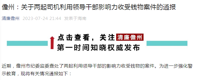 儋州:關(guān)于兩起司機(jī)利用領(lǐng)導(dǎo)干部影響力收受錢(qián)物案件的通報(bào)