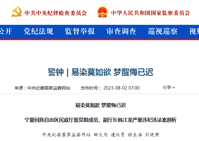 2022年3月,韓江龍因涉嫌嚴(yán)重違紀(jì)違法,接受寧夏回族自治區(qū)紀(jì)委監(jiān)委紀(jì)律審查和監(jiān)察調(diào)查。2022年11月,韓江龍被開(kāi)除黨籍、開(kāi)除公職,其涉嫌犯罪問(wèn)題被移送檢察機(jī)關(guān)依法審查起訴。2022年12月,韓江龍因犯受賄罪,被判處有期徒刑十二年六個(gè)月,并處罰金人民幣二百二十萬(wàn)元。