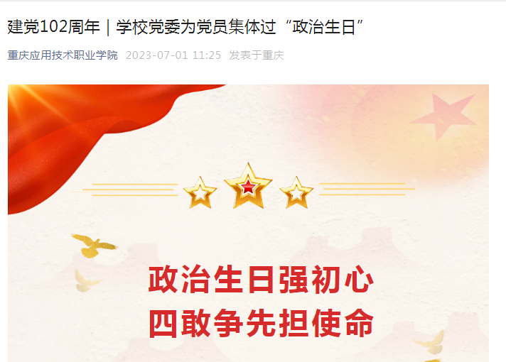 溫初心 鏗鏘誓言鑄忠誠(chéng) “我志愿加入中國(guó)共產(chǎn)黨,擁護(hù)黨的綱領(lǐng),遵守黨的章程……”全體黨員右拳高擎,莊嚴(yán)肅穆地重溫了入黨誓詞。黨員們仿佛又回到了入黨時(shí)的情景,用鏗鏘有力的聲音再次向黨作出莊嚴(yán)承諾,初心受到洗禮,理想信念更加堅(jiān)定。 悟初心 使命在肩勇作為 “薛峰同志,2001年6月1日加入中國(guó)共產(chǎn)黨,黨齡21年;王書(shū)海同志,1996年6月3日加入中國(guó)共產(chǎn)黨,黨齡26年……”。工作人員宣讀完畢,王書(shū)海同志接過(guò)了“政治生日”賀卡、黨徽書(shū)簽和生日蛋糕,他反復(fù)端詳手里的“政治生日”賀卡,幸福溢于言表,心情久久不能平靜。王書(shū)海同志作為集體過(guò)“政治生日”黨員里黨齡最長(zhǎng)的代表,和大家分享了自己的入黨志愿和入黨歷程,讓大家充分了解了九幾年部隊(duì)入黨的情形,讓大家感動(dòng)萬(wàn)分。 學(xué)校黨委在贈(zèng)送賀卡的同時(shí)還為兩個(gè)校企合作單位送學(xué)贈(zèng)書(shū),并勉勵(lì)校企合作單位要積極參與學(xué)校學(xué)習(xí)貫徹習(xí)近平新時(shí)代中國(guó)特色社會(huì)主義思想主題教育和黨團(tuán)活動(dòng),確保學(xué)校和合作單位在各類(lèi)學(xué)習(xí)、活動(dòng)中強(qiáng)化溝通交流、不斷凝聚共識(shí)、深化校企合作,合力推進(jìn)學(xué)校人才培養(yǎng)計(jì)劃落地生根,合力推進(jìn)學(xué)校走內(nèi)涵式發(fā)道路目標(biāo)達(dá)成。 踐初心 砥礪奮進(jìn)從頭越 何菲同志再次向集體過(guò)“政治生日”的黨員表示熱烈的祝賀。她指出,共產(chǎn)黨員的生命有兩個(gè)起點(diǎn):一個(gè)起點(diǎn)拉開(kāi)人生的序幕,昭示著生命的伊始,記住它是對(duì)生命的珍視和珍重,紀(jì)念它是對(duì)賜予你生命的偉大母親的感動(dòng)和感恩;另一個(gè)起點(diǎn)是政治生日,代表著初心與使命,并讓其奮斗終生!從加入中國(guó)共產(chǎn)黨之日起,政治生命就開(kāi)始了,記住它是對(duì)黨的忠誠(chéng)和信仰,紀(jì)念它是每一名共產(chǎn)黨員對(duì)黨的感激和感謝。每名黨員都應(yīng)該牢牢記住這兩個(gè)生日。她強(qiáng)調(diào),學(xué)校全體黨員干部要永遠(yuǎn)不忘初心,堅(jiān)定信仰;要永遠(yuǎn)清白做人,干凈做事;要永遠(yuǎn)勇于擔(dān)當(dāng),敢于斗爭(zhēng),要永遠(yuǎn)保持黨員先進(jìn)性,在各項(xiàng)工作中爭(zhēng)當(dāng)先鋒、接續(xù)奮斗,在崗位履職盡責(zé)上有所作為,在學(xué)校事業(yè)發(fā)展關(guān)鍵期有所建樹(shù)! “一句誓言、一生作答”!儀式感滿(mǎn)滿(mǎn)的“政治生日”是難得的黨性鍛煉,也是黨員成長(zhǎng)進(jìn)步的新起點(diǎn)。大家紛紛表示,將以踔厲奮發(fā)的昂揚(yáng)姿態(tài),勇毅前行,發(fā)揚(yáng)“四敢”精神,以“敢”字創(chuàng)先、以“干”字爭(zhēng)優(yōu),以實(shí)干擔(dān)當(dāng)開(kāi)啟學(xué)校高質(zhì)量發(fā)展新篇章。