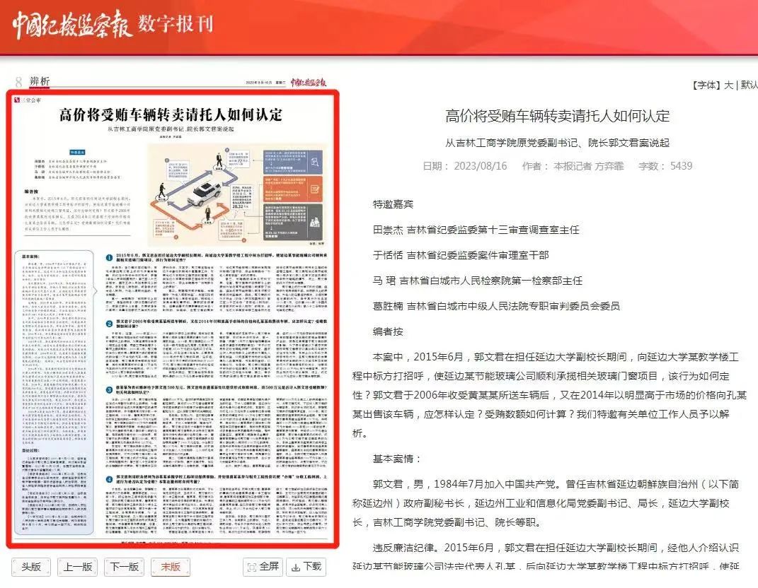 2013年6月,郭文君利用擔(dān)任延邊大學(xué)副校長職務(wù)上的便利,接受延邊某勘察公司總經(jīng)理孔某某的請托,為該公司承攬延邊大學(xué)某電源改造項(xiàng)目提供幫助。2014年11月,孔某某為感謝郭文君的幫助,以60萬元高價(jià)購買郭文君的汽車(為黃某某此前所送)。經(jīng)評估,雙方交易時(shí)該車市場價(jià)為31.68萬元。