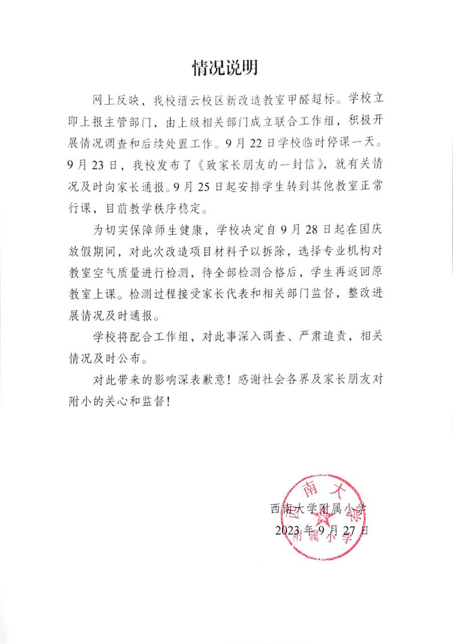 西南大學(xué)附屬小學(xué)縉云校區(qū)新改造教室甲醛超標(biāo),停課,拆除材料,嚴(yán)肅追責(zé)