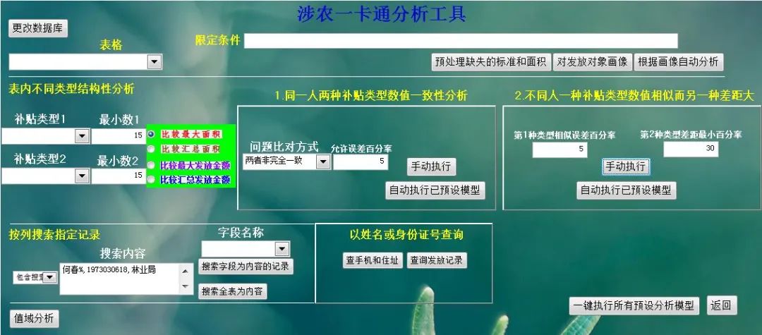 此分析工具設(shè)置了11個標(biāo)簽,給每個發(fā)放對象進行“畫像”,標(biāo)簽越多的疑點越突出。如設(shè)置了“是否村干部”標(biāo)簽,重點關(guān)注村干部在涉農(nóng)資金的分配中是否存在問題。為降低審計人員的使用難度,25個數(shù)據(jù)分析模型集成到了“一鍵執(zhí)行所有預(yù)設(shè)分析模型”按鈕中,一鍵直接將分析結(jié)果導(dǎo)出為電子表格。有特殊需求的審計人員還可通過手動選擇參數(shù)方式進一步分析,無需編寫sql語句就可實現(xiàn)“吃點菜”。同時工具還會生成“發(fā)放對象畫像表”、“村干部表”、“生產(chǎn)型或崗位每月500元以上發(fā)放表”三張基礎(chǔ)表,為其他審計項目提供基礎(chǔ)比對數(shù)據(jù)。