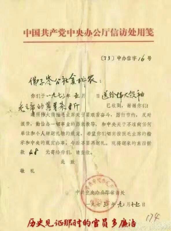 我國自古就是是禮儀之邦,禮尚往來也是平常事。毛主席為了人民的解放事業(yè)和美好生活日夜操勞,人民視他為心中的“紅太陽”。佛子嶺公社貧下中農(nóng)送給他老人家?guī)捉锊枞~,既是人際間的禮尚往來,更體現(xiàn)了人民群眾對偉大領袖的由衷愛戴和崇高敬意。換句話說,這是人民領袖與人民群眾水乳交融的象征,成了共產(chǎn)黨人與人民群眾血肉相聯(lián)的見證。然而,即便如此也不行。因為,中央有規(guī)定,“不準向任何單位和個人贈送禮物”。