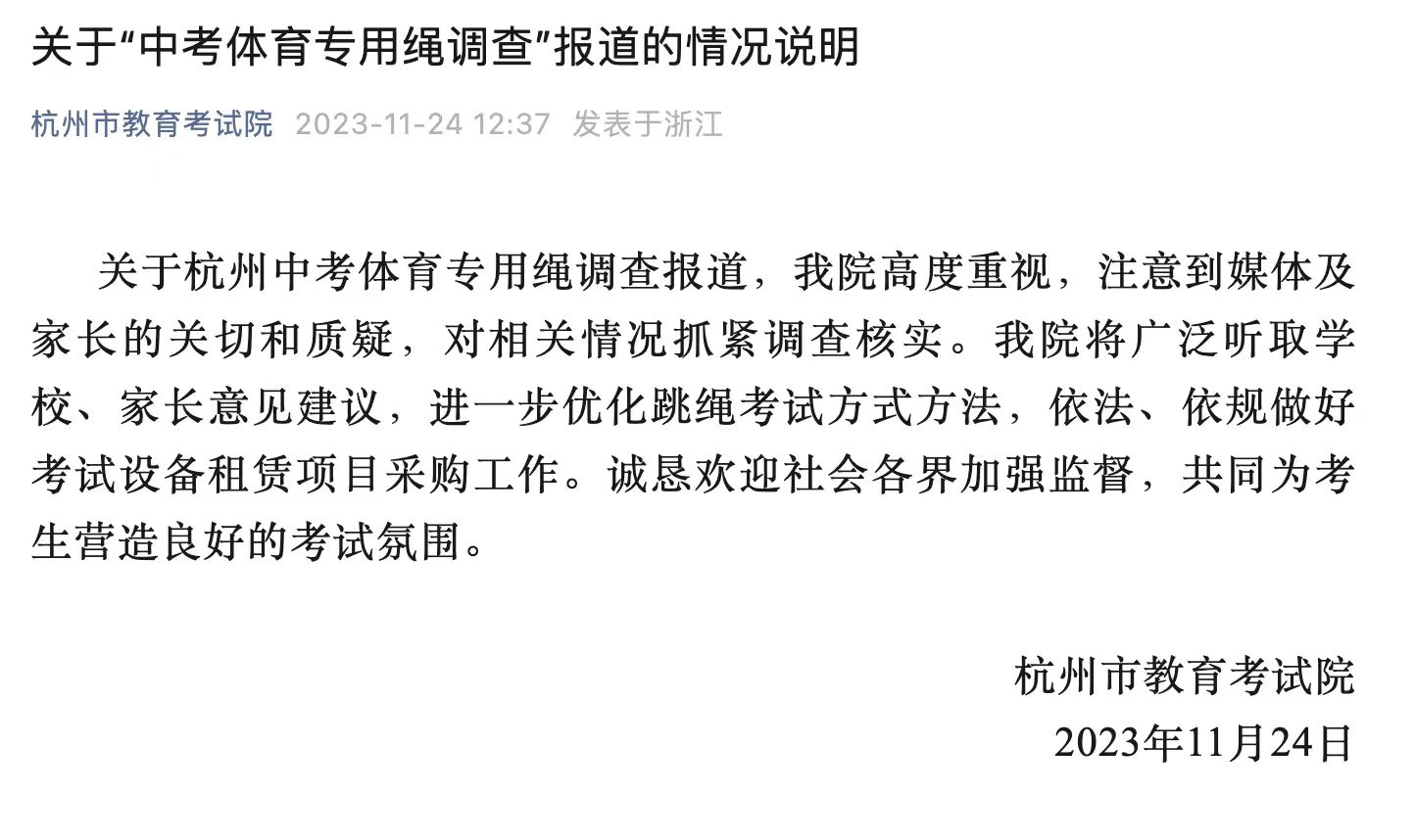 杭州市教育局相關(guān)負(fù)責(zé)人表示:“我們現(xiàn)在也在反思,是不是可以參照其他做得好的地方,完善目前的中考體育跳繩測評方式,包括能否允許學(xué)生自帶繩子參加考試,能否選用更多品牌的跳繩設(shè)備等,避免給學(xué)生和家長帶來不必要的困擾和負(fù)擔(dān)?!?/span>