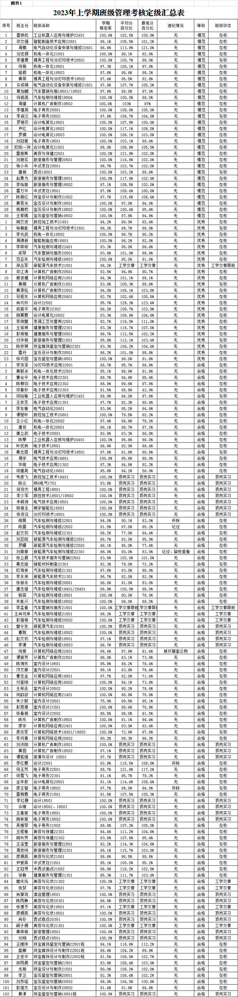 根據(jù)《關(guān)于印發(fā)<郴州技師學(xué)院班級(jí)管理考核定級(jí)及班主任績(jī)效考核辦法>的通知》(郴技〔2020〕30號(hào))文件要求和規(guī)定,經(jīng)教學(xué)系初評(píng)申報(bào),學(xué)生工作處、招生就業(yè)處、財(cái)務(wù)處、后勤處、保衛(wèi)處、團(tuán)委審核,擬評(píng)選工業(yè)機(jī)器人應(yīng)用與維護(hù)22401等29個(gè)班為模范等級(jí),數(shù)控加工技術(shù)21601班等23個(gè)班為優(yōu)秀等級(jí),電氣自動(dòng)化設(shè)備安裝與維修22601班等103個(gè)班為合格等級(jí),現(xiàn)予以公示(定級(jí)情況見附件)。