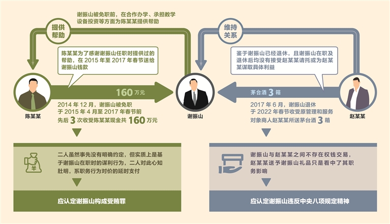 趙春玲:經(jīng)查,謝振山被免職后,于2015年4月至2017年春節(jié)前,先后3次收受陳某某現(xiàn)金共160萬元;謝振山退休后,于2022年春節(jié)收受原管理和服務(wù)對象商人趙某某所送茅臺酒3箱。因上述行為發(fā)生在謝振山退出領(lǐng)導(dǎo)崗位后,我們著重從謝振山與二人的平日交往、有無經(jīng)濟(jì)往來、收受時間、往來緣由、是否有謀利事項等方面收集固定證據(jù)。最終查明,160萬元系陳某某為感謝謝振山在任時提供的幫助而送,應(yīng)認(rèn)定謝振山收受160萬元的行為構(gòu)成受賄罪;謝振山在退休后收受趙某某為了維持關(guān)系而送的茅臺酒,應(yīng)認(rèn)定為違反中央八項規(guī)定精神。