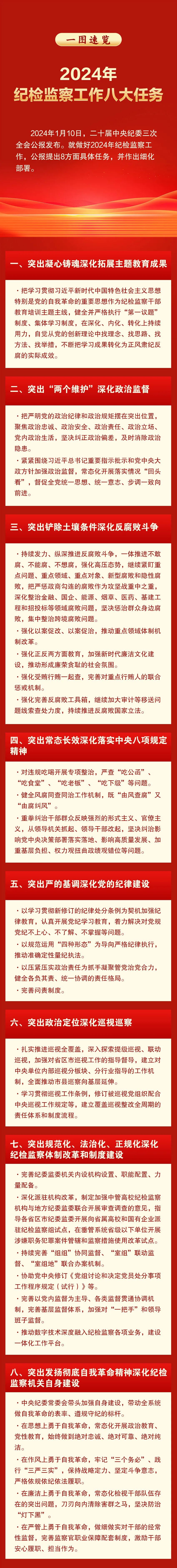 全會提出,2024年是中華人民共和國成立75周年,是實現“十四五”規(guī)劃目標任務的關鍵一年。做好今年紀檢監(jiān)察工作,要堅持以習近平新時代中國特色社會主義思想為指導,全面貫徹落實黨的二十大和二十屆二中全會精神,深入學習貫徹習近平總書記關于黨的自我革命的重要思想,堅決落實全面從嚴治黨戰(zhàn)略方針,深刻領悟“兩個確立”的決定性意義,自覺增強“四個意識”、堅定“四個自信”、做到“兩個維護”,堅持穩(wěn)中求進工作總基調,鞏固拓展主題教育和教育整頓成果,忠誠履行黨章和憲法賦予的職責,推動健全全面從嚴治黨體系,縱深推進正風肅紀反腐,縱深推進新征程紀檢監(jiān)察工作高質量發(fā)展,為全面推進中國式現代化提供堅強保障。