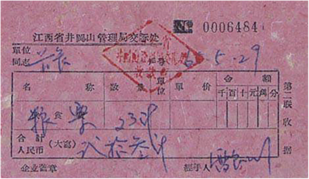 聽了他的話,會(huì)計(jì)只好拿出發(fā)票,但卻不知如何填寫這張發(fā)票,最后還是秘書提醒說:“交款人就寫首長吧!”會(huì)計(jì)又緊張又激動(dòng),在發(fā)票的交款人一欄中寫下“首長”二字,然后依次開出了三張發(fā)票,發(fā)票號(hào)碼為00006482、00006483、00006484,票證為“江西省井岡山管理局交際處”。毛澤東住宿時(shí)間7天,每天伙食費(fèi)2.5元,共計(jì)17.5元。交糧票23斤,購大米款每斤0.12元,計(jì)2.76元。發(fā)票開具時(shí)間為1965年5月29日。