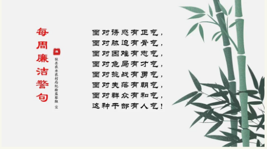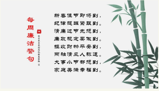 “新年新氣象,期待新作風(fēng),自覺遵規(guī)守紀(jì),力戒‘慵懶撒’等不良習(xí)氣,嚴(yán)禁無故遲到、早退、擅自離崗等違反工作紀(jì)律行為。”2月27日,縣農(nóng)口系統(tǒng)干職工又按時(shí)收到來自駐農(nóng)業(yè)農(nóng)村局紀(jì)檢監(jiān)察組推送的“每周廉潔警句”。