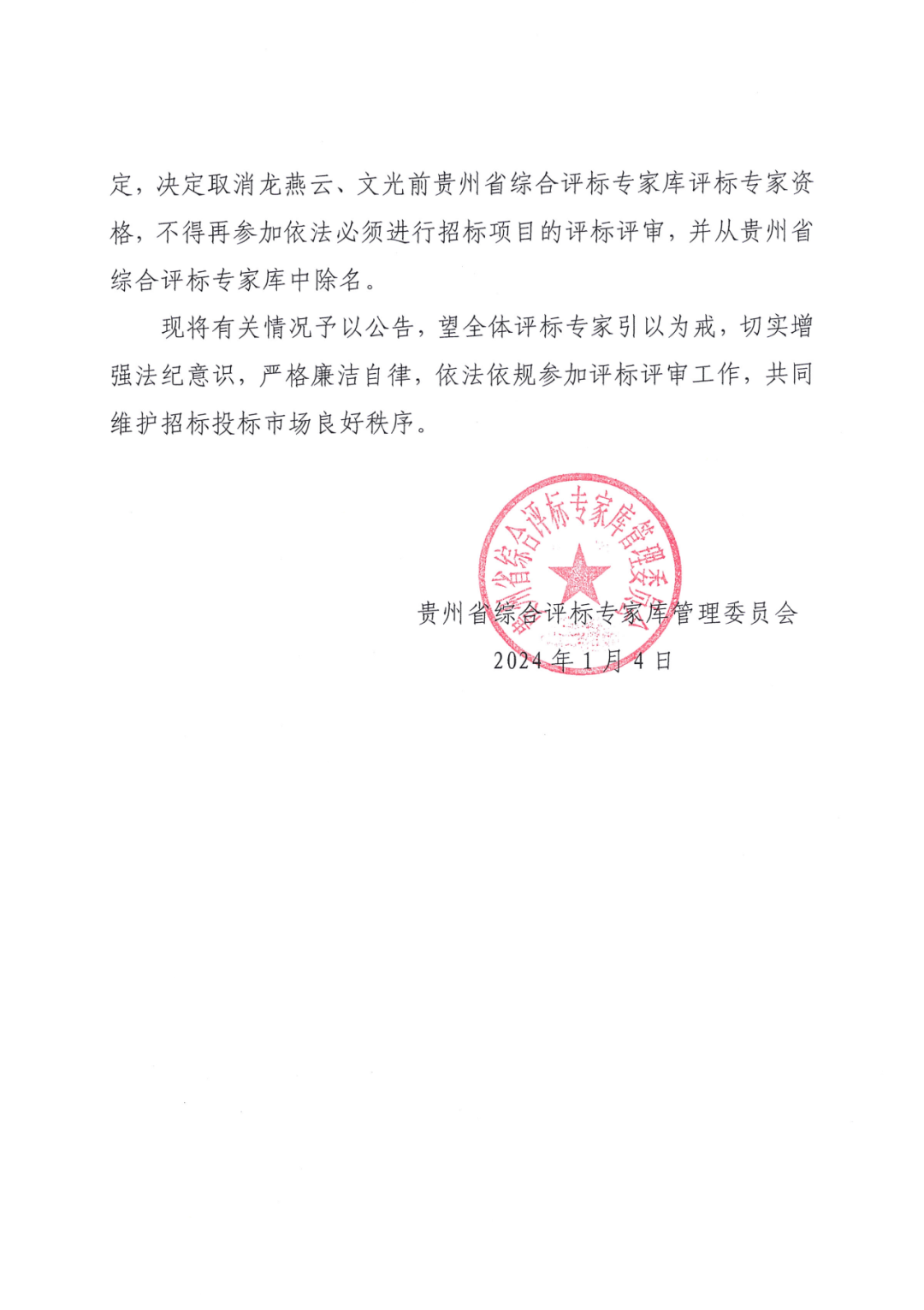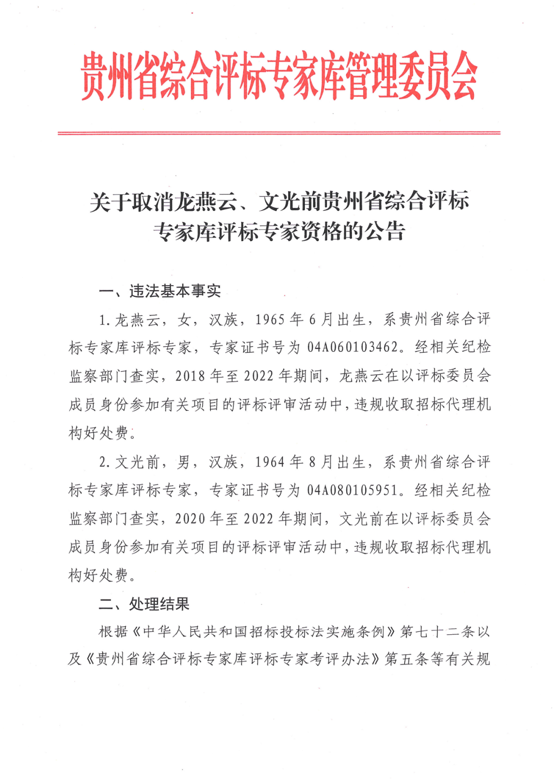 貴州省綜合評標專家?guī)旃芪瘯P(guān)于取消龍燕云、文光前評標專家資格的公告