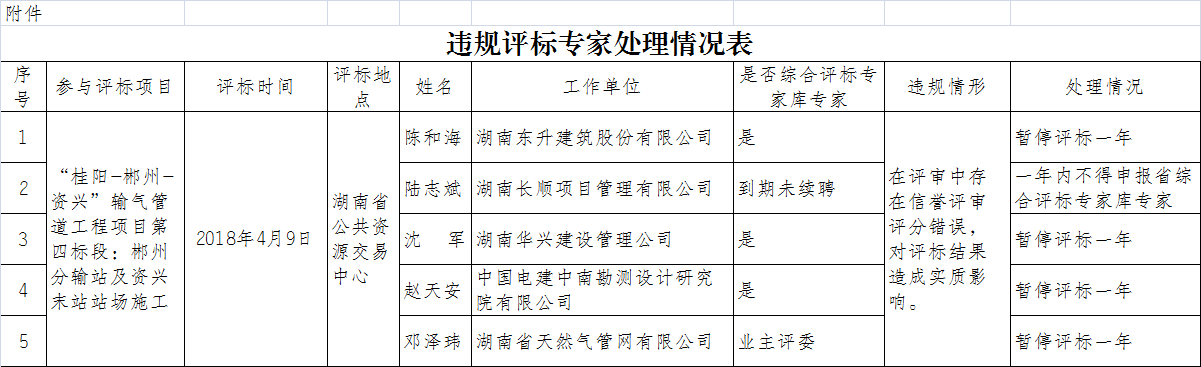 根據《湖南省綜合評標專家?guī)旌驮u標專家管理辦法》第三十七條第三項規(guī)定,為嚴肅評標工作紀律,加強對評標專家的監(jiān)督管理,經研究決定,對陳和海、陸志斌、沈軍、趙天安、鄧澤瑋等5名評標專家暫停評標一年。