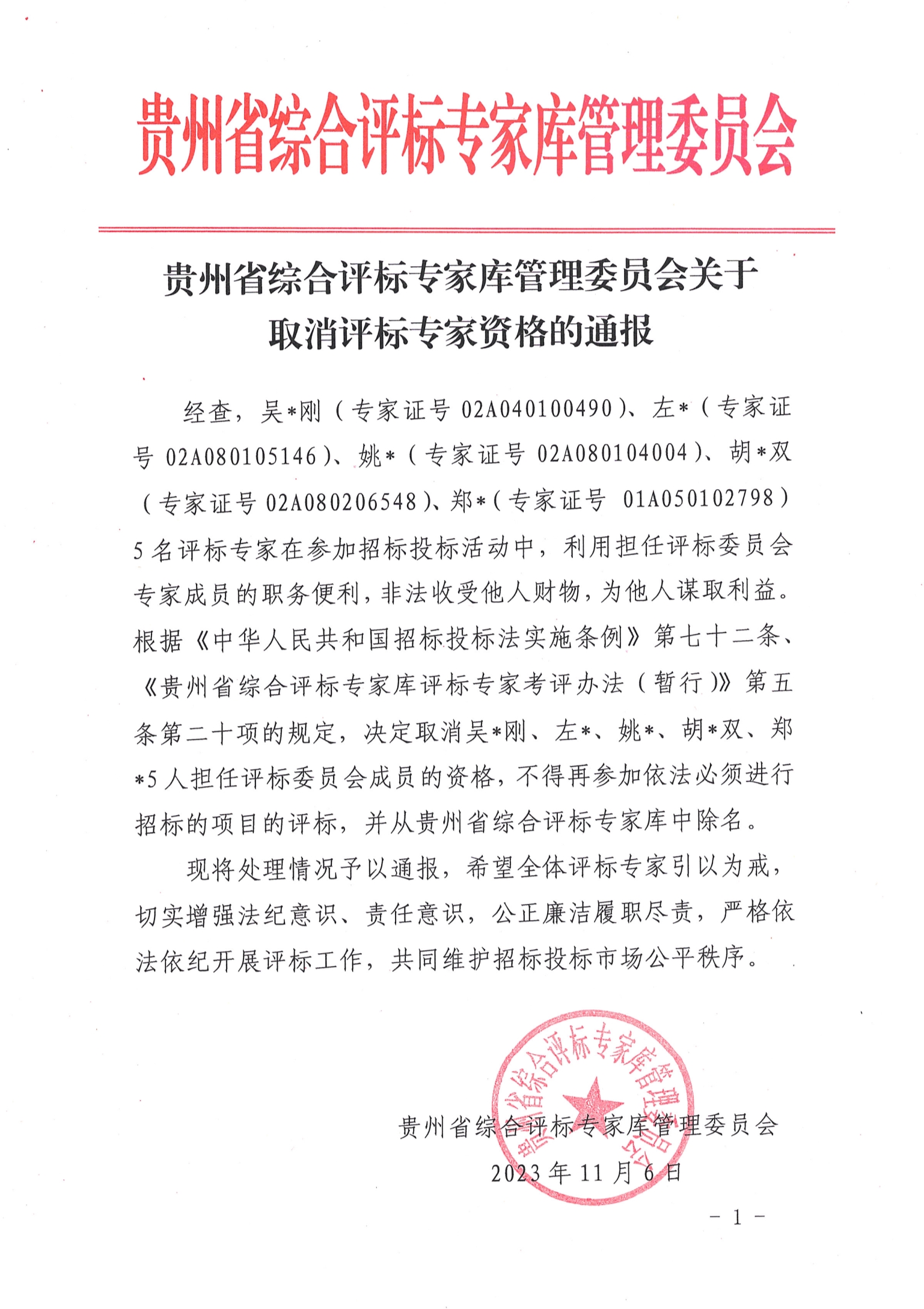 貴州省綜合評(píng)標(biāo)專家?guī)旃芾砦瘑T會(huì)關(guān)于取消吳某剛等五名評(píng)標(biāo)專家資格的通報(bào)