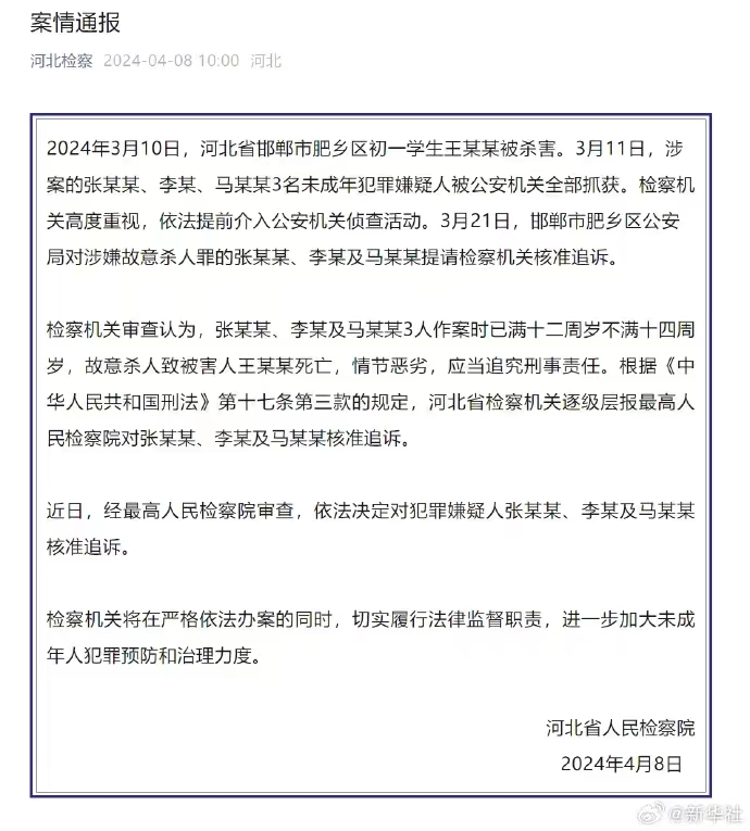 3月17日,河北省邯鄲市肥鄉(xiāng)區(qū)委宣傳部官方微信公眾號“微觀肥鄉(xiāng)”發(fā)布通報稱,2024年3月10日,邯鄲市肥鄉(xiāng)區(qū)初一學生王某某被殺害。3月11日,涉案犯罪嫌疑人被全部抓獲,已依法采取刑事強制措施。