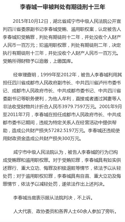 據(jù)湖北省咸寧市中級人民法院官方微博消息,咸寧中院12日公開宣判四川省委原副書記李春城受賄、濫用職權(quán)案,對李春城兩罪并罰,決定執(zhí)行有期徒刑13年,并處沒收個人財產(chǎn)100萬元。受賄所得財物予以追繳,上繳國庫。
