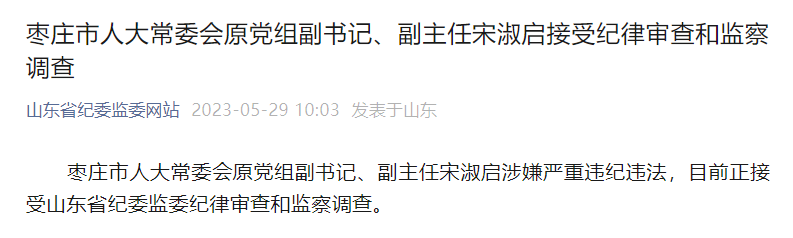 經(jīng)山東省委批準(zhǔn),山東省紀(jì)委監(jiān)委對棗莊市人大常委會原黨組副書記、副主任宋淑啟嚴(yán)重違紀(jì)違法問題進行了立案審查調(diào)查。