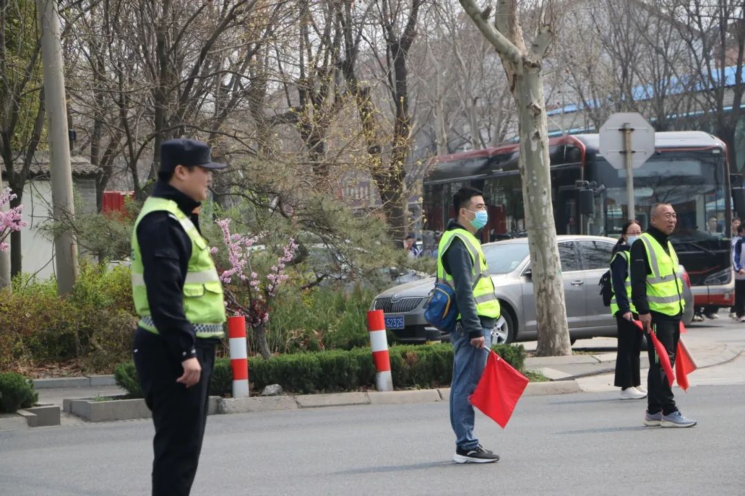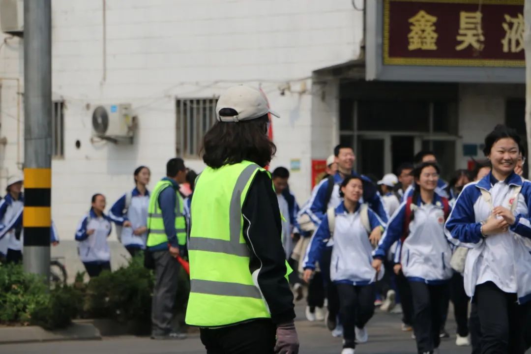 春風(fēng)駘蕩,萬物明朗。同學(xué)們以班級(jí)為單位排成兩列縱隊(duì),邁著整齊的步伐有序行進(jìn)。一路上,鳥語花香,旗幟飄揚(yáng)。沿途的各個(gè)路口,都有提前等候的老師們?cè)诎踩瘋?,以確保師生安全通行。