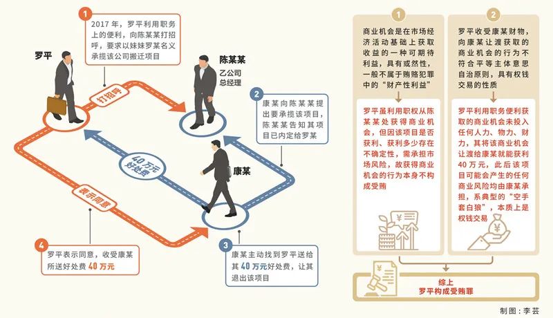 第二,羅平收受康某財(cái)物,向康某讓渡獲取的商業(yè)機(jī)會(huì)的行為不符合平等主體意思自治原則,具有權(quán)錢交易的性質(zhì)。正常商業(yè)機(jī)會(huì)的產(chǎn)生是基于平等主體之間的意思自治和實(shí)現(xiàn)正常民事行為的需要,民事主體通過(guò)正常市場(chǎng)競(jìng)爭(zhēng)獲得商業(yè)機(jī)會(huì),符合公平合理的交易原則。本案中,羅平和康某獲得的商業(yè)機(jī)會(huì)并非通過(guò)正常的市場(chǎng)競(jìng)爭(zhēng)獲得??的诚低ㄟ^(guò)給予羅平40萬(wàn)元,希望羅平將該商業(yè)機(jī)會(huì)即搬遷項(xiàng)目讓給其承攬。而羅平利用職務(wù)便利獲取的商業(yè)機(jī)會(huì)尚未投入任何人力、物力、財(cái)力,其將該商業(yè)機(jī)會(huì)直接讓渡給康某就能獲利40萬(wàn)元,此后該項(xiàng)目可能產(chǎn)生的任何商業(yè)風(fēng)險(xiǎn)均由康某承擔(dān),系典型的“空手套白狼”。羅平與康某之間具有明顯的權(quán)錢交易性質(zhì),系行受賄關(guān)系。