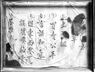 在井岡山革命博物館里,珍藏著一塊灰白色的方粗布,長87厘米,寬81厘米,上面寫著:(1)捆鋪草;(2)上門板;(3)買賣公平;(4)言語和氣;(5)借東西要還,損壞要賠償;(6)不準(zhǔn)亂翻東西。
