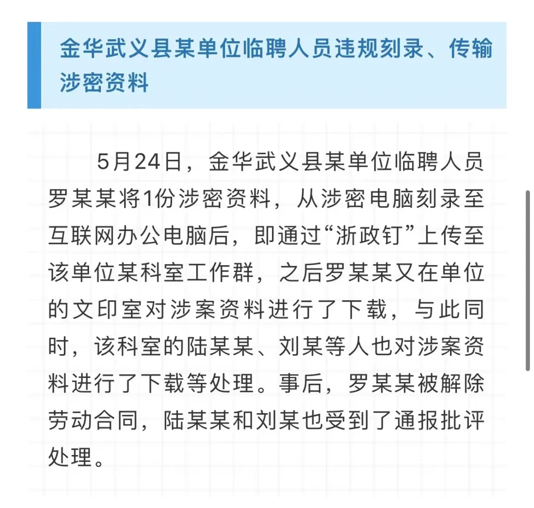 2023年,浙江省委保密辦、省國家保密局依紀(jì)依法依規(guī)查處了一批違反保密法律法規(guī)的案件,為充分發(fā)揮懲前毖后的警示教育作用,現(xiàn)將7起典型案例通報(bào)如下。