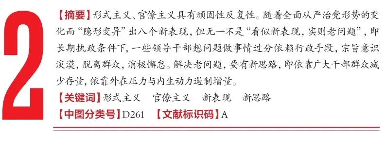 形式主義、官僚主義具有頑固性反復(fù)性,燃點(diǎn)低、蔓延快,隨著全面從嚴(yán)治黨形勢(shì)的變化而“隱形變異”、花樣翻新。黨的十八大以來,從制定和執(zhí)行中央八項(xiàng)規(guī)定開始,全黨自上而下糾正“四風(fēng)”取得顯著成效。在這種形勢(shì)下,形式主義、官僚主義仍然改頭換面、大行其道。2017年黨的十九大后,新華社《形式主義、官僚主義新表現(xiàn)值得警惕》一文,總結(jié)了十種形式主義、官僚主義新表現(xiàn):一些領(lǐng)導(dǎo)干部調(diào)研走過場(chǎng)、搞形式主義,調(diào)研現(xiàn)場(chǎng)成了“秀場(chǎng)”;一些單位“門好進(jìn)、臉好看”,就是“事難辦”;一些地方注重打造領(lǐng)導(dǎo)“可視范圍”內(nèi)的項(xiàng)目工程,“不怕群眾不滿意,就怕領(lǐng)導(dǎo)不注意”;有的地方層層重復(fù)開會(huì),用會(huì)議落實(shí)會(huì)議;部分地區(qū)寫材料、制文件機(jī)械照抄,出臺(tái)制度決策“依葫蘆畫瓢”;一些干部辦事拖沓敷衍、懶政庸政怠政,把責(zé)任往上推;一些地方不重實(shí)效重包裝,把精力放在“材料美化”上,搞“材料出政績(jī)”;有的領(lǐng)導(dǎo)干部熱衷于將責(zé)任下移,“履責(zé)”變“推責(zé)”;有的干部知情不報(bào)、聽之任之,態(tài)度漠然;有的干部說一套做一套、臺(tái)上臺(tái)下兩個(gè)樣。