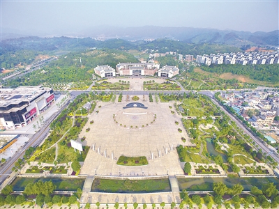 靠?jī)扇耸掷植拍墉h(huán)抱住的銀杏古樹,6株一字排開,挺立在縣委、縣政府大樓坪前;與大樓正門相對(duì),空曠的廣場(chǎng)上,8根圖騰石柱屹立于中央,沿著中軸線依次分列成弧線狀。廣場(chǎng)四周,高樓林立……