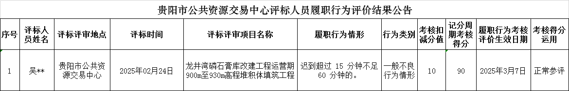 根據(jù)《貴州省評標專家評價考核辦法》(黔發(fā)改法規(guī)〔2024〕42號)相關(guān)規(guī)定,對吳*輝等評標人員進行了扣減分(詳見附件)??鄯智闆r已進行履職行為評價建議公示,公示期內(nèi)未收到異議(申辯)。根據(jù)《貴州省評標專家評價考核辦法》第九條相關(guān)規(guī)定現(xiàn)將評價結(jié)果進行公告,公告期:2025年3月7日至2025年9月6日,期滿后轉(zhuǎn)為后臺保存。