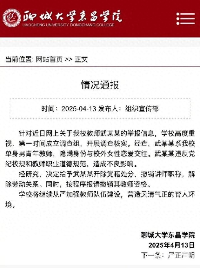 聊城大學東呂學院關于網上教師武某某相關舉報信息的調查情況通報