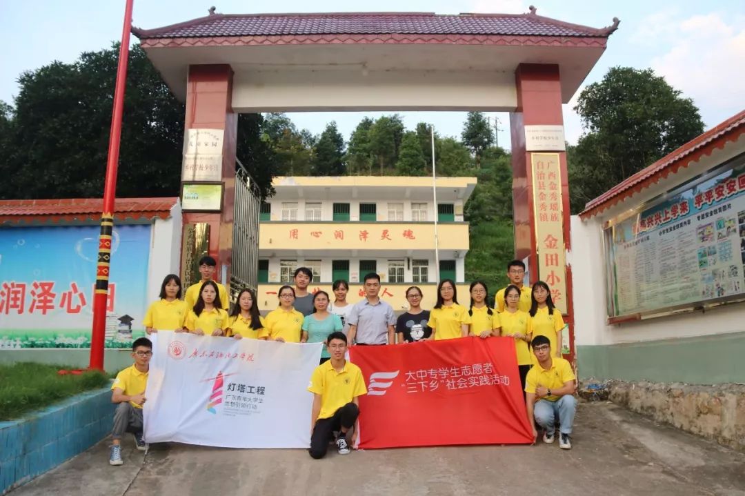 茂南區(qū)團委副書記、掛職金秀縣委辦副主任江靈進,團縣委掛職副書記韋曉玲,團縣委干事李衛(wèi)洋,金田小學陶永英老師與逐夢心光的全體隊員合影