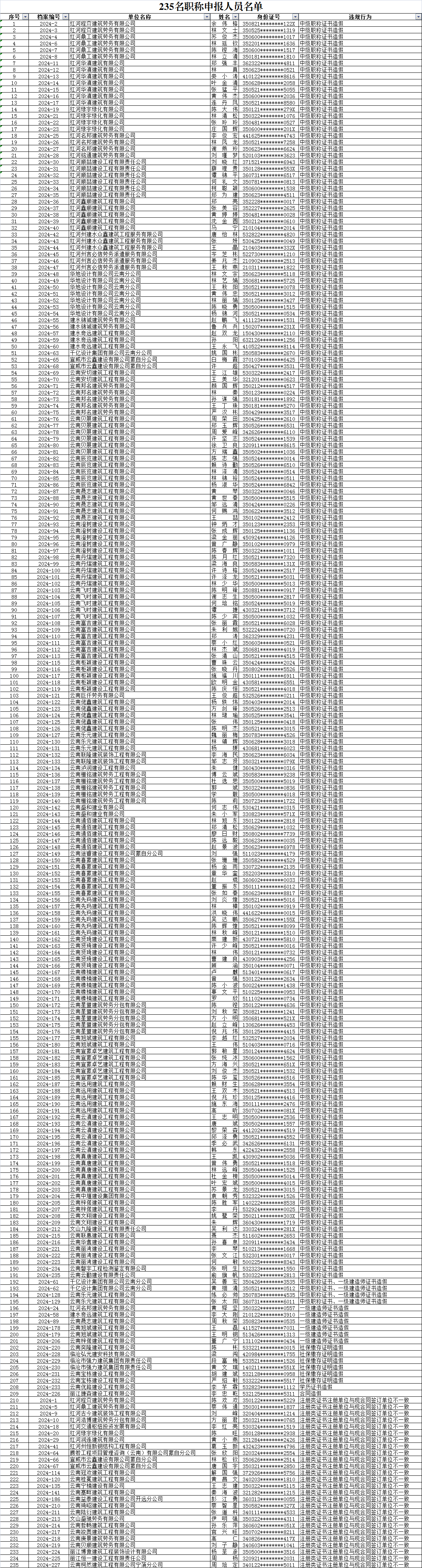 經(jīng)調(diào)查核實(shí),235名申報(bào)人在2024年建筑工程高級(jí)職稱申報(bào)評(píng)審中存在提供偽造申報(bào)材料的違規(guī)行為,其中191人中級(jí)職稱證書造假、4人中級(jí)職稱證書和一級(jí)建造師證書造假、6人一級(jí)建造師證書造假、6人社保繳存證明造假、1人學(xué)歷證書造假、1人合同造假、26人注冊(cè)類證書注冊(cè)單位與現(xiàn)合同簽訂單位不一致,根據(jù)人力資源和社會(huì)保障部《職稱評(píng)審監(jiān)管暫行辦法》(人社部發(fā)〔2024〕56號(hào))第五條、第十七條規(guī)定,擬將235名申報(bào)人記入誠信檔案庫,記錄期為3年(2025年、2026年、2027年),3年內(nèi)不得申報(bào)評(píng)審職稱。