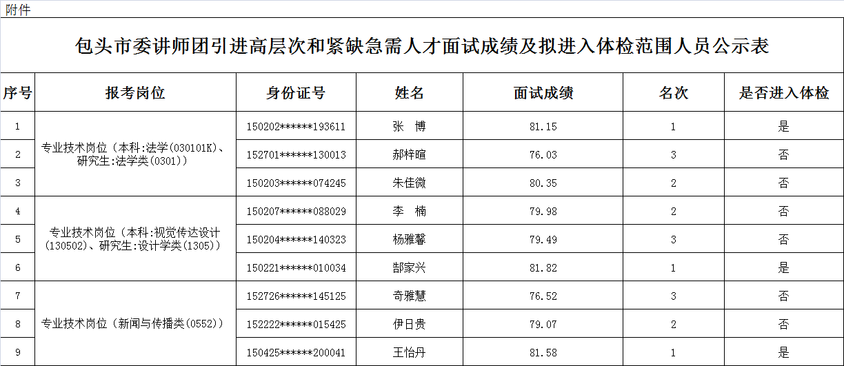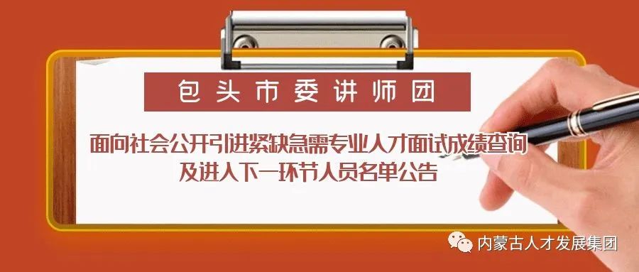 根據(jù)《包頭市委講師團面向社會公開引進高層次和緊缺急需專業(yè)人才公告》,包頭市委講師團引進高層次和緊缺急需人才面試工作已完成,現(xiàn)將面試成績及擬進入體檢范圍人員名單(詳見附件)公示如下: