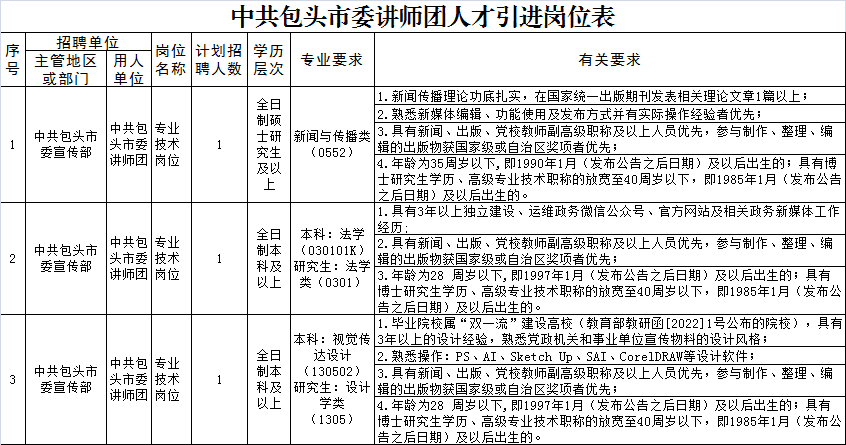 本次計劃公開引進高層次和緊缺急需人才3人,具體崗位及要求詳見《中共包頭市委講師團人才引進崗位表》(下文簡稱《崗位表》,詳見附件1)。
