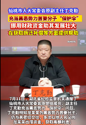 丁克勤明知龍某某為黑惡勢(shì)力首要分子,仍與其密切交往,多次以他人名義向龍某某出借資金,獲取高額利息;利用擔(dān)任仙桃市財(cái)政局局長(zhǎng)等職務(wù)便利,挪用財(cái)政資金供龍某某實(shí)際控制的公司解決資金周轉(zhuǎn)困難,違規(guī)為該公司在返還土地出讓金、獲取拆遷補(bǔ)償?shù)确矫嫣峁椭L(zhǎng)該團(tuán)伙發(fā)展壯大。丁克勤還存在其他嚴(yán)重違紀(jì)違法問(wèn)題,受到開(kāi)除黨籍處分,按規(guī)定取消退休待遇,涉嫌犯罪問(wèn)題被移送檢察機(jī)關(guān)依法審查起訴。