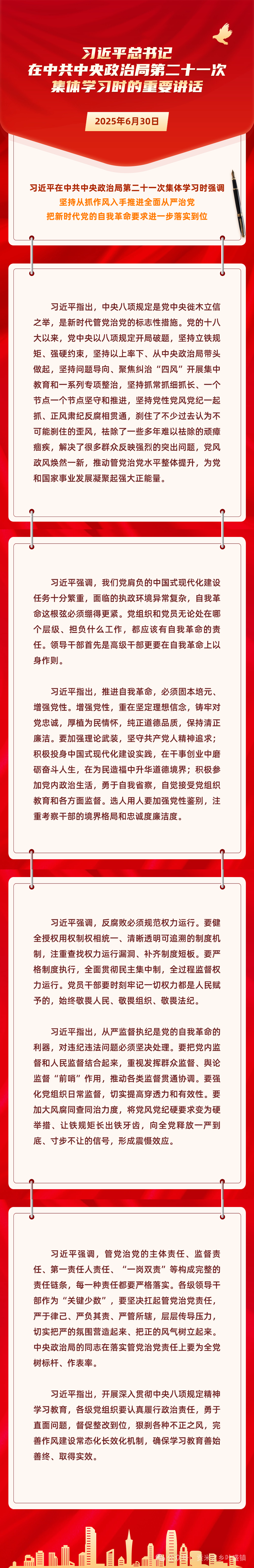 中共中央政治局6月30日下午就健全落實中央八項規(guī)定精神、糾治“四風”長效機制進行第二十一次集體學習。中共中央總書記習近平代表黨中央,向全國廣大共產(chǎn)黨員致以“七一”的節(jié)日問候!他在主持學習時強調(diào),自我革命是我們黨跳出治亂興衰歷史周期率的第二個答案,從抓作風入手推進全面從嚴治黨是新時代黨的自我革命一條重要經(jīng)驗。推進黨的自我革命,要在提高認識、增強黨性、規(guī)范權(quán)力運行、從嚴監(jiān)督執(zhí)紀、履行管黨治黨責任等方面進一步落實到位。