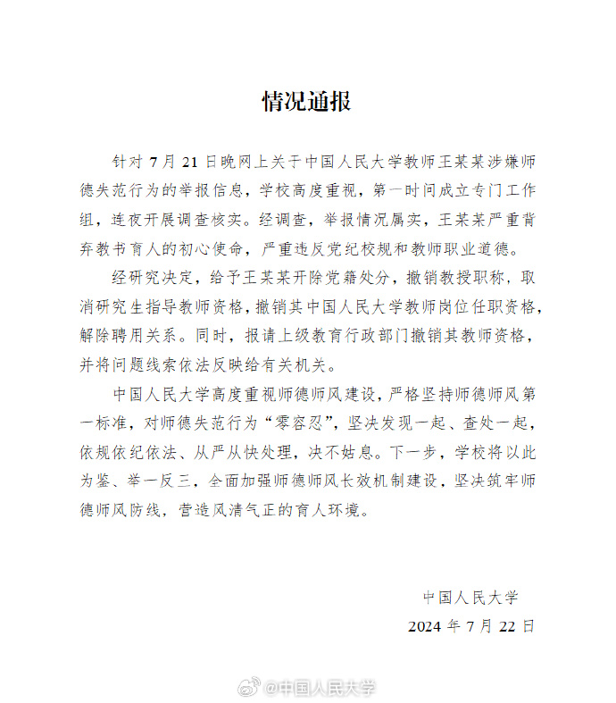 中國(guó)人民大學(xué)關(guān)于教師王某某涉嫌師德失范舉報(bào)的情況通報(bào)