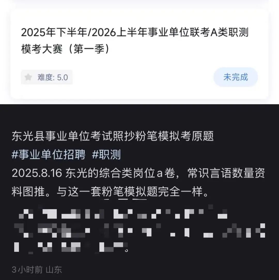 8月18日,瀟湘晨報記者通過整理網友評論發(fā)現,東光縣事業(yè)單位公開招聘考試部分試題疑“照抄照搬”粉筆APP2025年下半年/2026年上半年事業(yè)單位聯考A類職測??即筚悾ǖ谝患荆?,記者隨后聯系到粉筆APP客服,據其介紹,該套模擬題于7月18日上線。
