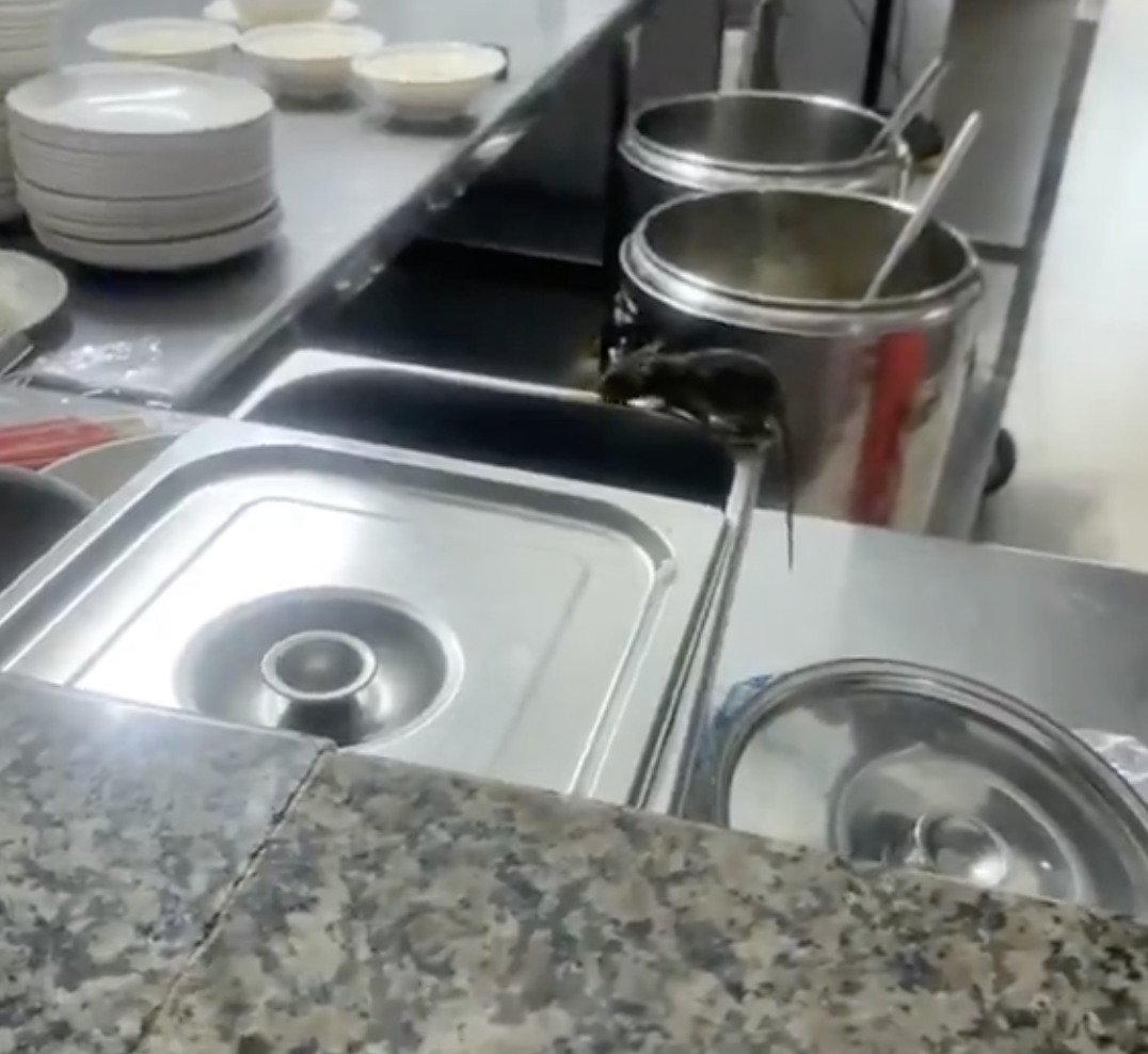 8月13日,有網(wǎng)友發(fā)視頻,稱廣東茂名技師學(xué)院的食堂中有老鼠爬來(lái)爬去?,F(xiàn)場(chǎng)視頻顯示,老鼠在裝菜盆上,隨后爬到邊緣舔舐食品湯汁。