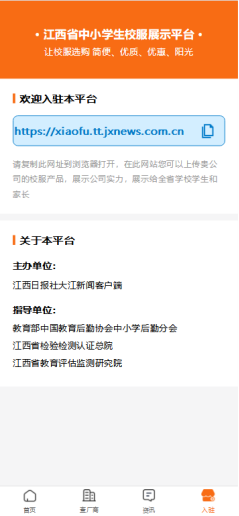 該平臺由江西日報社大江新聞客戶端聯(lián)合教育部中國教育后勤協(xié)會中小學后勤分會、江西省檢驗檢測認證總院、江西省教育評估監(jiān)測研究院共同打造。平臺核心功能是公開征集并集中展示全省校服款式,為學校和家長提供透明、便捷的選購渠道。