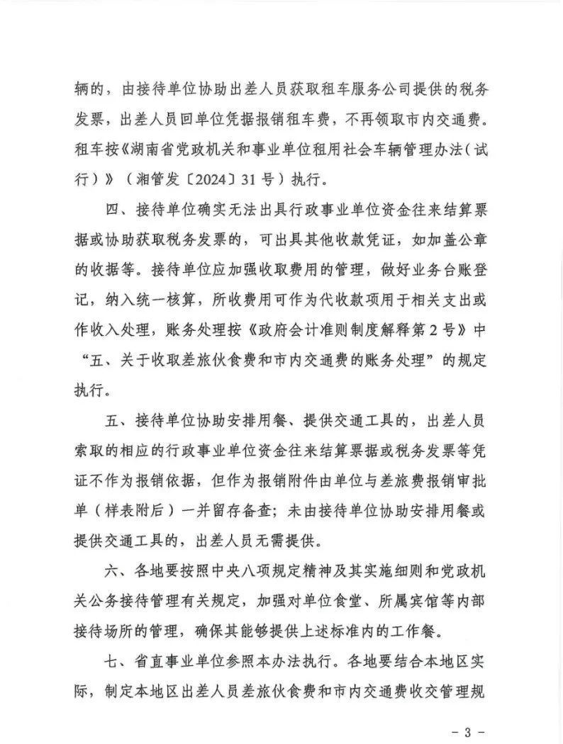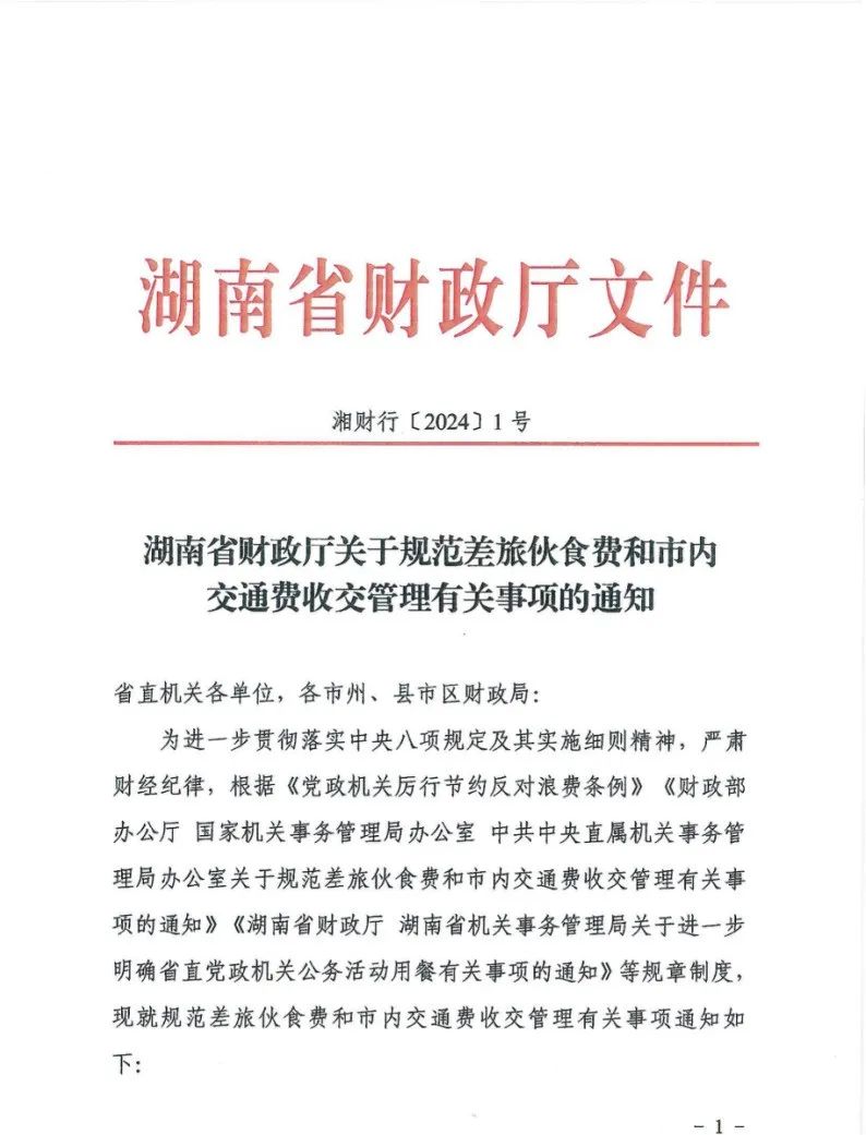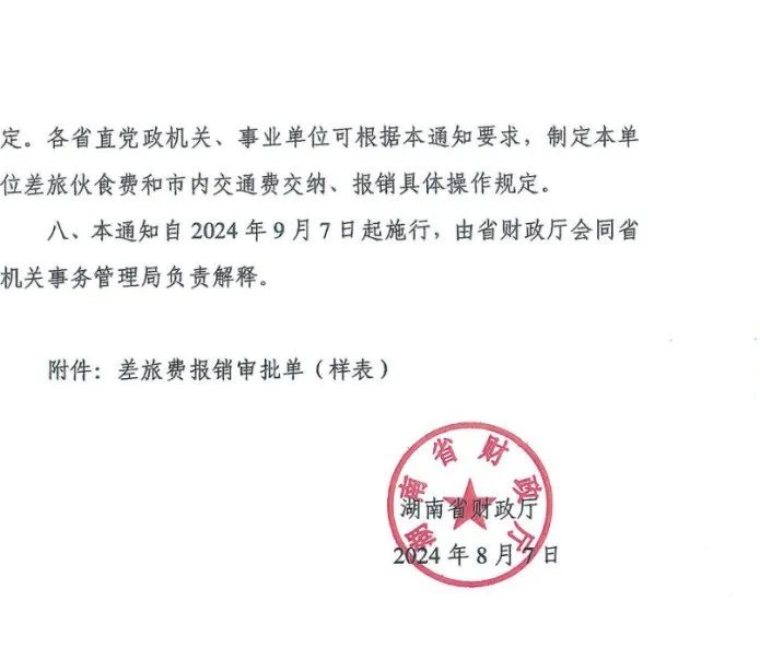 為進(jìn)一步規(guī)范省直單位差旅費(fèi)管理,嚴(yán)肅財(cái)經(jīng)紀(jì)律,近日,湖南省財(cái)政廳印發(fā)《關(guān)于規(guī)范差旅伙食費(fèi)和市內(nèi)交通費(fèi)收交管理有關(guān)事項(xiàng)的通知》(湘財(cái)行〔2024〕1號(hào),以下簡(jiǎn)稱《通知》),在《湖南省省直機(jī)關(guān)差旅費(fèi)管理辦法》基礎(chǔ)上,對(duì)差旅伙食費(fèi)和市內(nèi)交通費(fèi)收交管理作了進(jìn)一步明確,規(guī)定自9月7日起,省直單位出差人員在接待單位協(xié)助安排用餐和用車情況下,須嚴(yán)格按規(guī)定,分類依標(biāo)準(zhǔn)交納差旅伙食費(fèi)和市內(nèi)交通費(fèi)。
