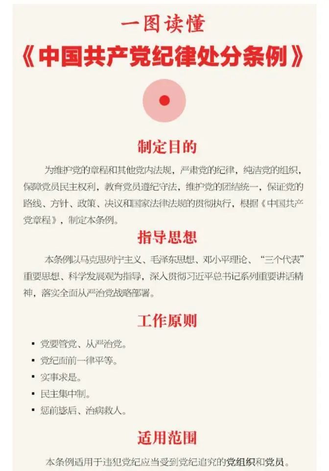 第一條 為了維護黨章和其他黨內(nèi)法規(guī),嚴肅黨的紀律,純潔黨的組織,保障黨員民主權(quán)利,教育黨員遵紀守法,維護黨的團結(jié)統(tǒng)一,保證黨的路線、方針、政策、決議和國家法律法規(guī)的貫徹執(zhí)行,根據(jù)《中國共產(chǎn)黨章程》,制定本條例。