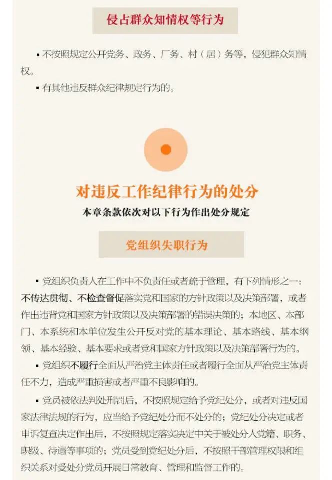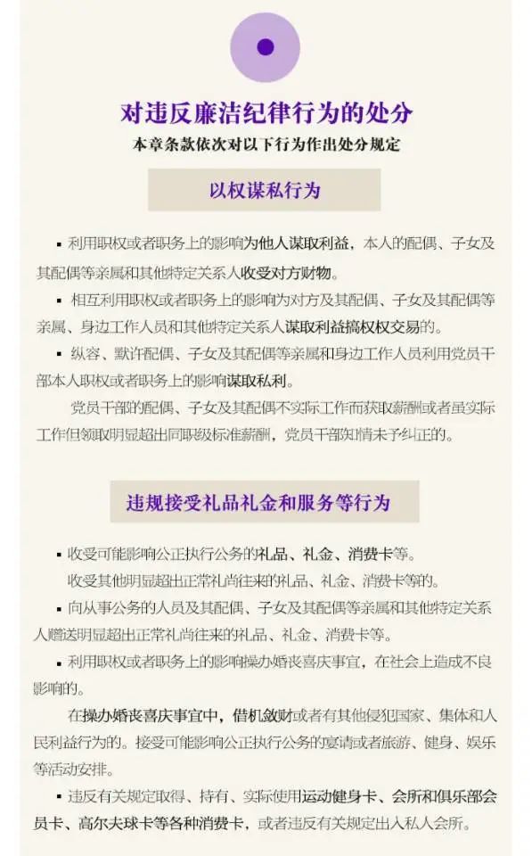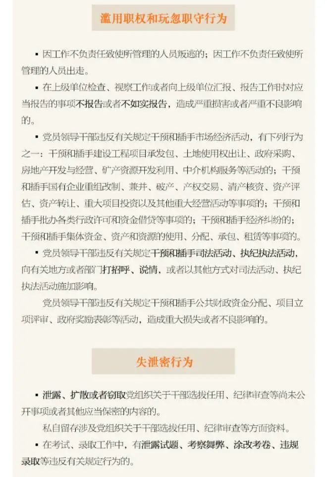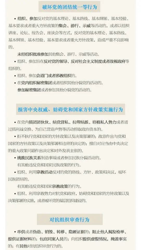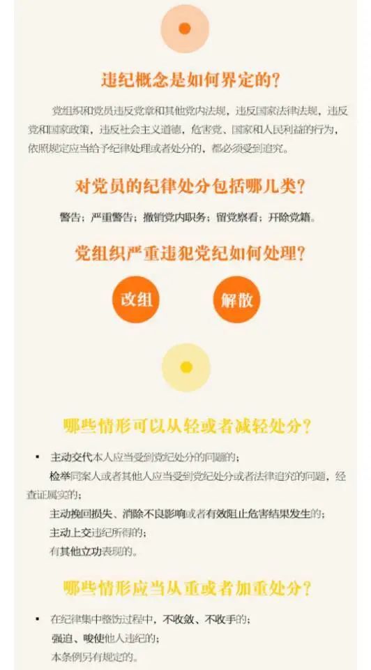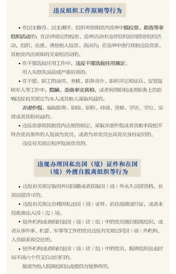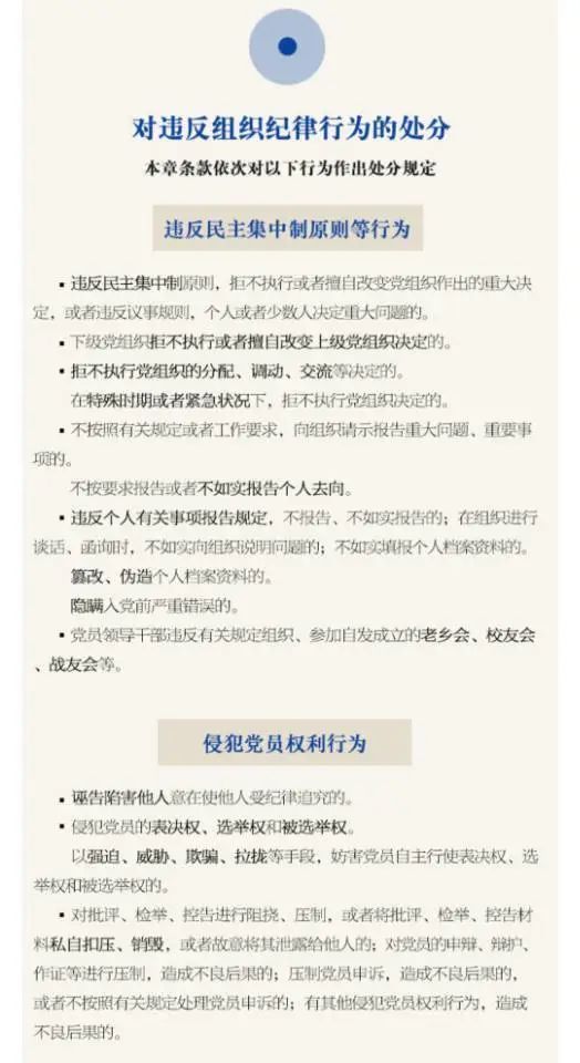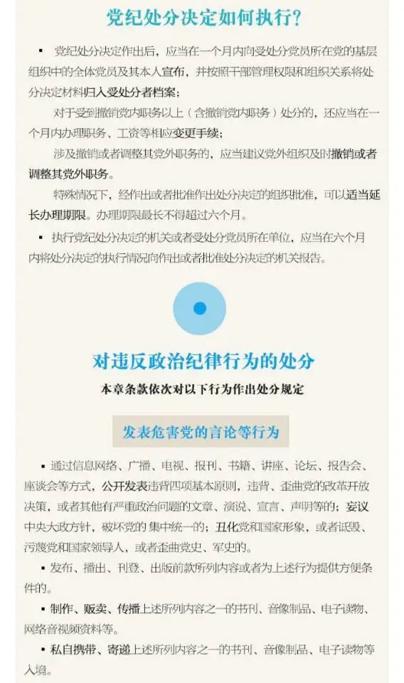 第一百二十八條 泄露、擴散或者打探、竊取黨組織關(guān)于干部選拔任用、紀律審查、巡視巡察等尚未公開事項或者其他應當保密的內(nèi)容的,給予警告或者嚴重警告處分;情節(jié)較重的,給予撤銷黨內(nèi)職務或者留黨察看處分;情節(jié)嚴重的,給予開除黨籍處分。